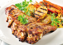 an gerösteten Kartoffelscheiben und glasierten Fingermörchen