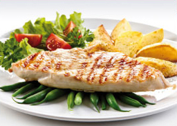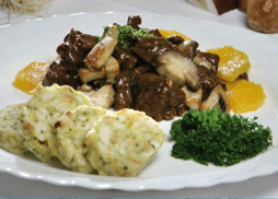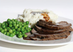 mit Bio-Erbsen und Kartoffelpüree, dazu leicht gebundener Bratensaft
