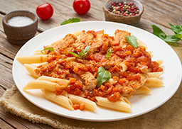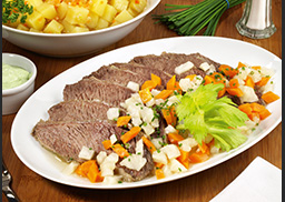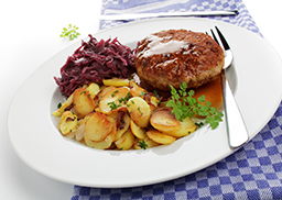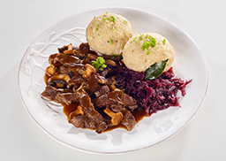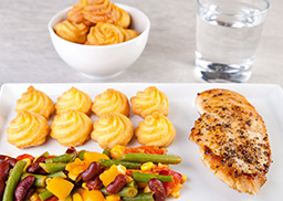 mit Kartoffelgratin, Champignons, Rahmsauce und knackige grüne Bohnen