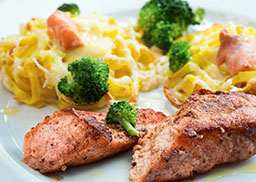 dazu Tagliatelle mit heller Sauce und Broccoli