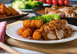 mit Kartoffelkroketten und gedünstetem Broccoli