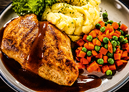 dazu Kartoffelpüree mit feinen Kräutern und Mischgemüse