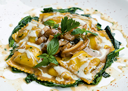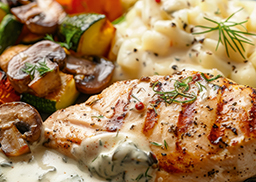 in cremiger Dill-Sauce, dazu gegrilltes mediterranes Gemüse und gebundene Kartoffeln