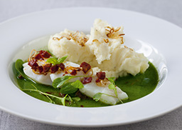 mit mildem Kartoffelpüree, auf einem Spiegel aus fein püriertem Spinat