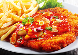 mit knusprigen Pommes Julienne, in pikanter Sauce