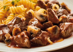 mit Champignons und Zwiebeln, dazu Bio-Spiralen