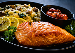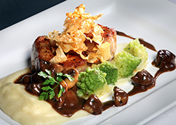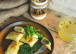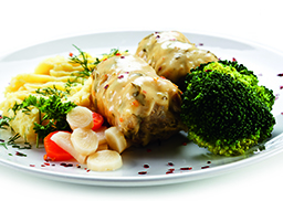 mit einer Einlage aus Wurzelgemüse, dazu Kartoffelpüree und Broccoli