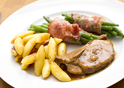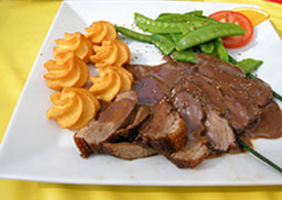 mit Herzoginkartoffeln und Kaiserschoten