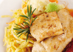 mit Geflügelschinken, dazu Romanescogemüse und Röstkartoffeln