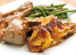 gebettet auf Kartoffelspalten und Apfelsegmenten, dazu Karottenscheiben